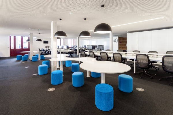 其辦公室裝修通過(guò)創(chuàng)造一個(gè)開(kāi)放的工作空間,加強(qiáng)了公司各部門之間的交流。通過(guò)在開(kāi)放空間之中的沉思場(chǎng)所的設(shè)計(jì)也達(dá)到了個(gè)人和集體的平衡。因此,小空間通過(guò)固定的元素,如圖書(shū)館和半開(kāi)放會(huì)議室,或可移動(dòng)的家具,如一些用于 Skype 聊天的構(gòu)筑物,得到了巧妙的利用。