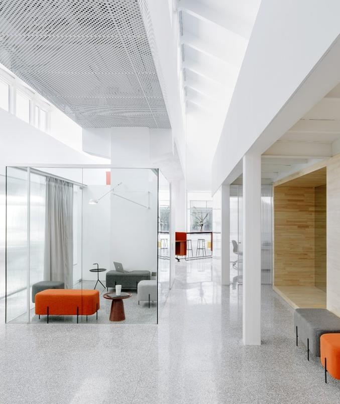 某創(chuàng)意園區(qū)辦公室裝修茶水間設(shè)計:將茶水間放置在兩翼的樞軸上意圖在于是其成為辦公室的社交中心,同時可以通過全玻璃立面欣賞到花園景觀。茶水間的前面有一個服務(wù)區(qū),儲藏食品的同時設(shè)置了服務(wù)器室、門衛(wèi)室、浴室、淋浴間和洗滌區(qū)。辦公室的設(shè)計爭取較大化每個部門的利益: 例如會計和管理或許會需要一個非常私人的辦公室,又或?;雍蜏贤ǖ牟块T需要一個開放的空間配置。紅色密度板圍合出來的盒子隱藏著兩個CEO的辦公室,他們可以享受大棚子的自然光和全高窗戶的花園景觀。