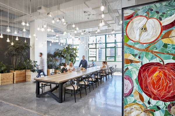 注重復(fù)古和手工藝品的Etsy總部,自然要體現(xiàn)這一獨(dú)特元素的設(shè)計(jì)和運(yùn)用,室內(nèi)大量的藝術(shù)品、裝飾品和家具都來(lái)自當(dāng)?shù)氐乃囆g(shù)家以及Etsy的網(wǎng)店賣(mài)家。入口處手工制作的大型吊燈更是令時(shí)尚辦公網(wǎng)的小伙伴們驚艷。在Etsy總部沒(méi)有華麗的材料堆砌,只有隨處可見(jiàn)的藝術(shù)品、墻面壁畫(huà)、充滿創(chuàng)意的手工藝品、有趣的裝飾品,還有生機(jī)勃勃的綠色植物。