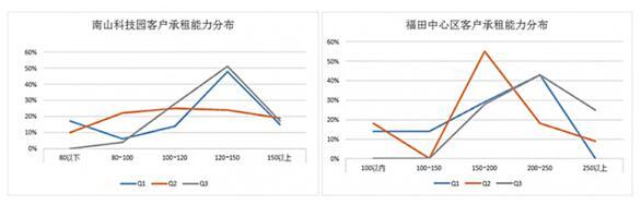 3、核心區(qū)域客戶承租能力普遍下滑,以福田中心區(qū)、南山科技園*為顯著
