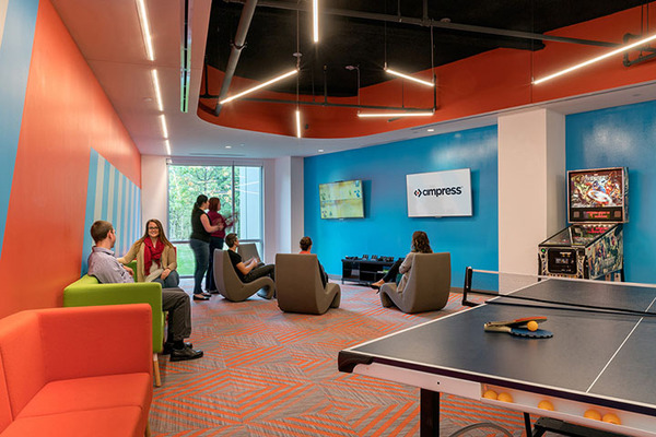 其辦公室裝修設(shè)計呈現(xiàn)出熱情洋溢、時尚活力的空間氛圍。躍動的色彩激發(fā)著人們的創(chuàng)意靈感;靈動的布局鼓勵員工的深度合作與交流;精彩的設(shè)計映射出Cimpress與時俱進(jìn)、不斷發(fā)展前進(jìn)的文化理念。