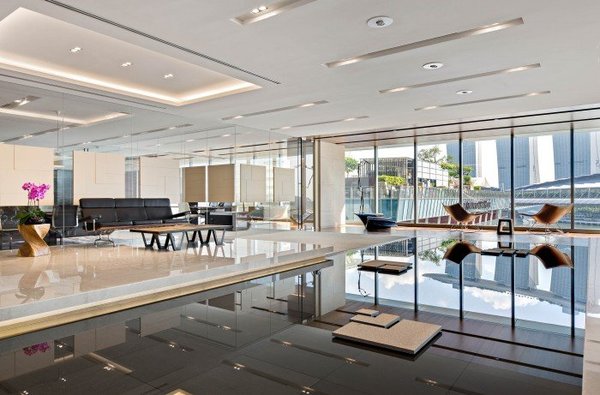 其辦公室裝修設(shè)計寧靜優(yōu)美、夢幻仙境、根植于亞洲的文化特征、精神文化的傳達(dá)、漂浮于水上的玻璃會議室、視覺體驗。