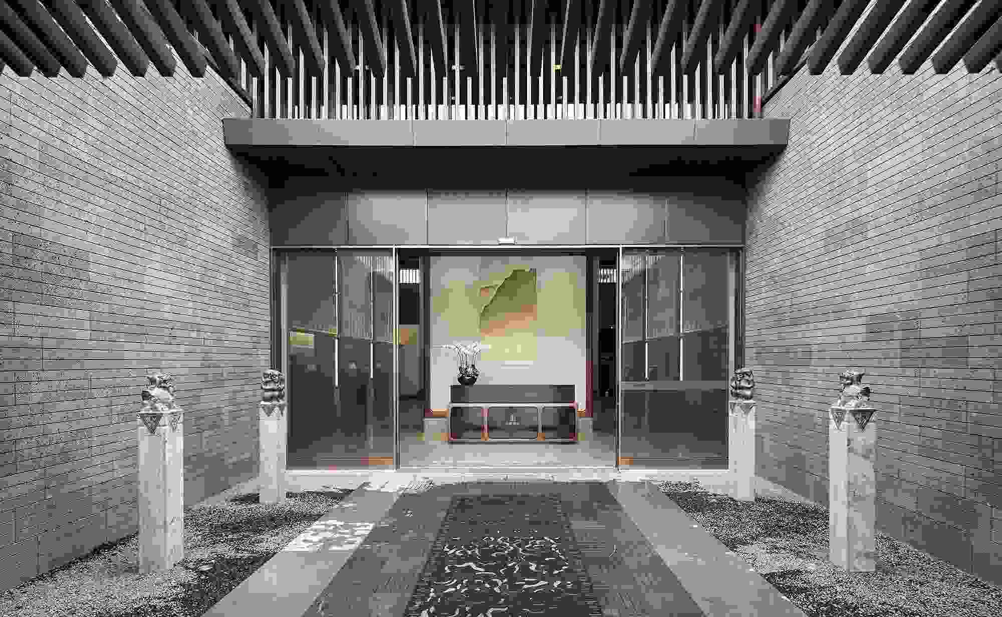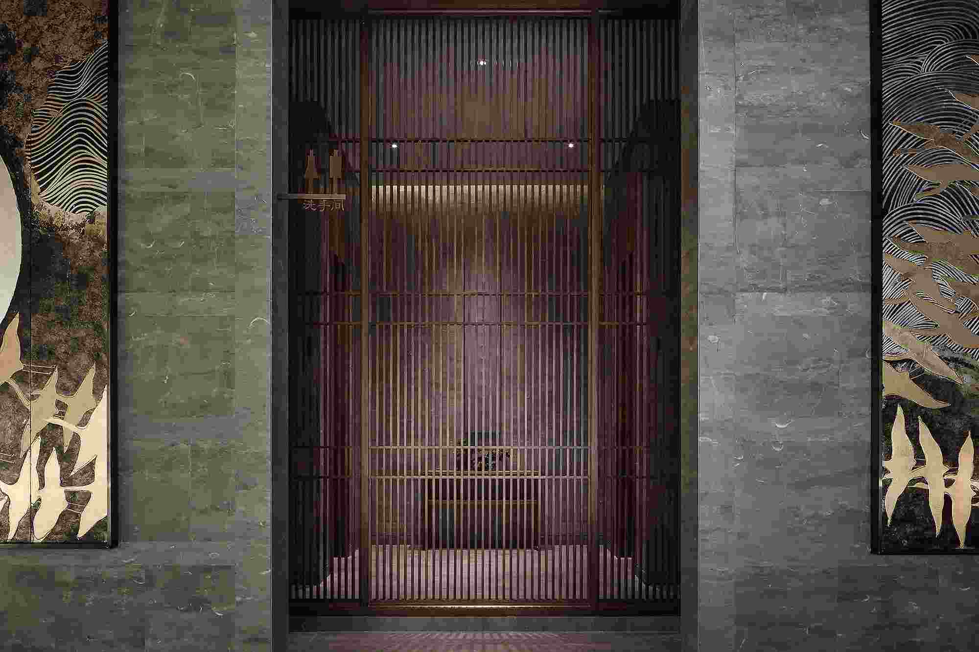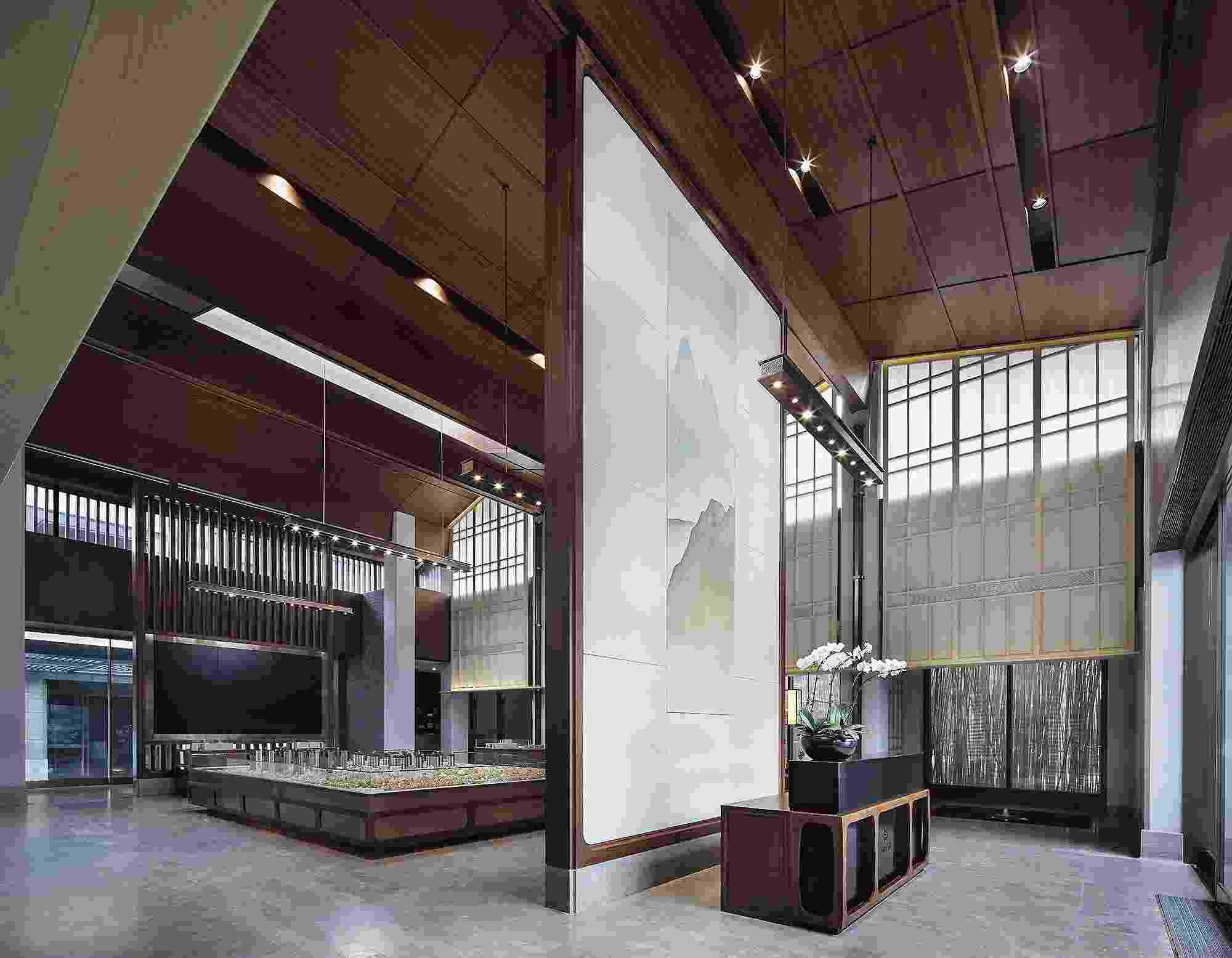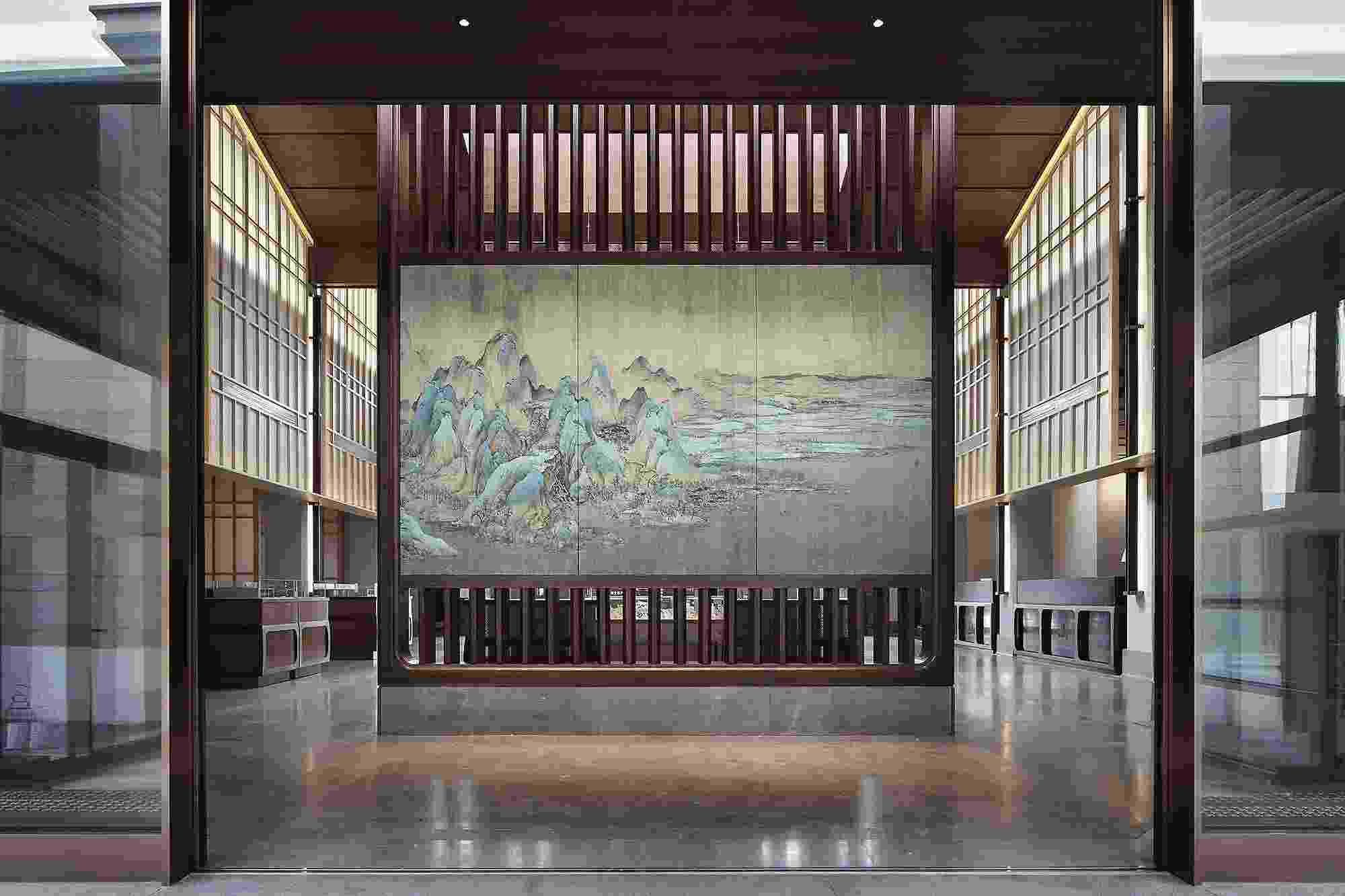 大廳內(nèi)高聳起伏的木質(zhì)屋頂結(jié)構(gòu)秩序井然,天井凌空處,將室外自在的光亮拽入屋內(nèi),吐故納新,渾然天成;天地相銜接的另一端側(cè)則是有序且虛實(shí)相間的木質(zhì)隔斷,山巒起伏的中式重彩畫(huà)屏斷與原先的照壁墻呼應(yīng),自是相得益彰,正應(yīng)了“淡妝濃抹總相宜”的寓意。