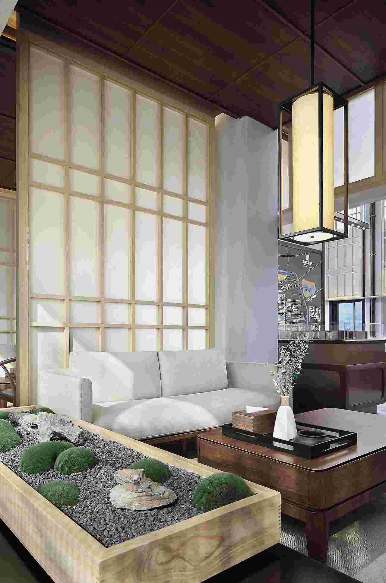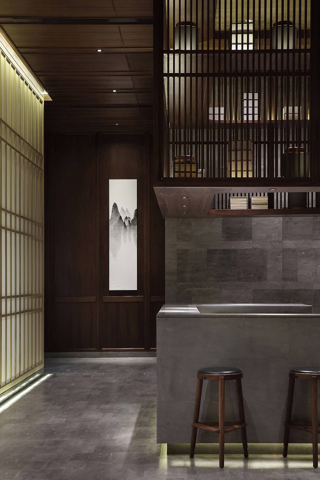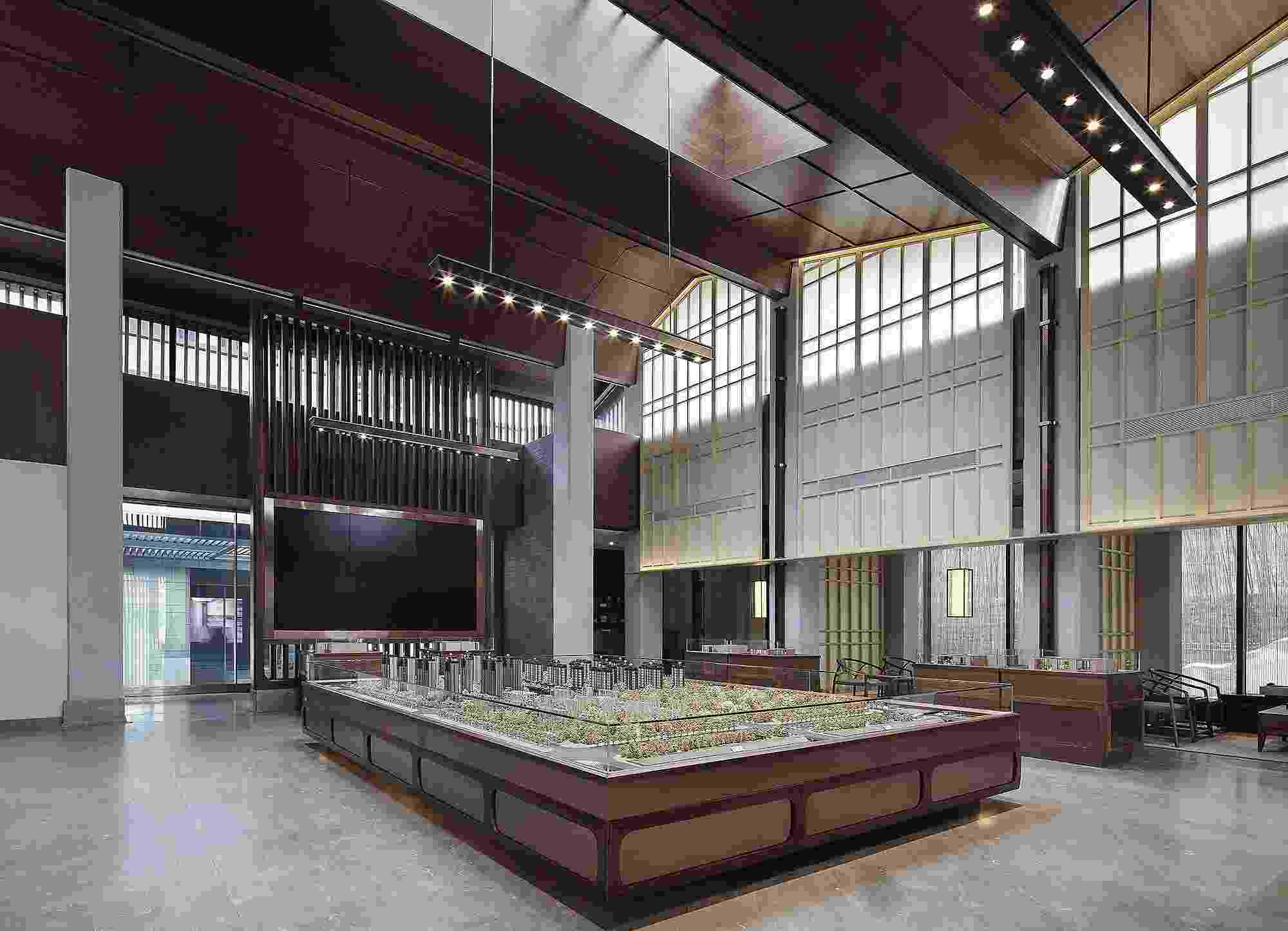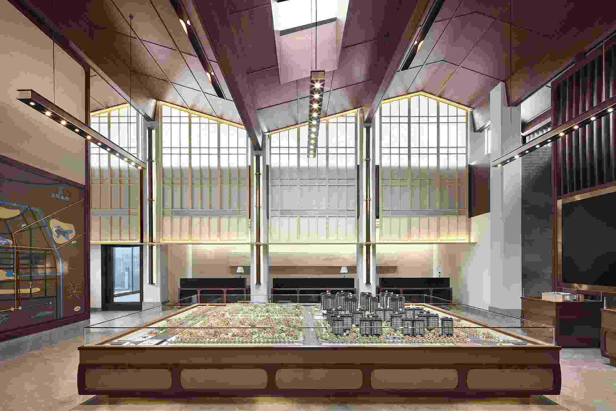 大廳內(nèi)高聳起伏的木質(zhì)屋頂結(jié)構(gòu)秩序井然,天井凌空處,將室外自在的光亮拽入屋內(nèi),吐故納新,渾然天成;天地相銜接的另一端側(cè)則是有序且虛實(shí)相間的木質(zhì)隔斷,山巒起伏的中式重彩畫(huà)屏斷與原先的照壁墻呼應(yīng),自是相得益彰,正應(yīng)了“淡妝濃抹總相宜”的寓意。