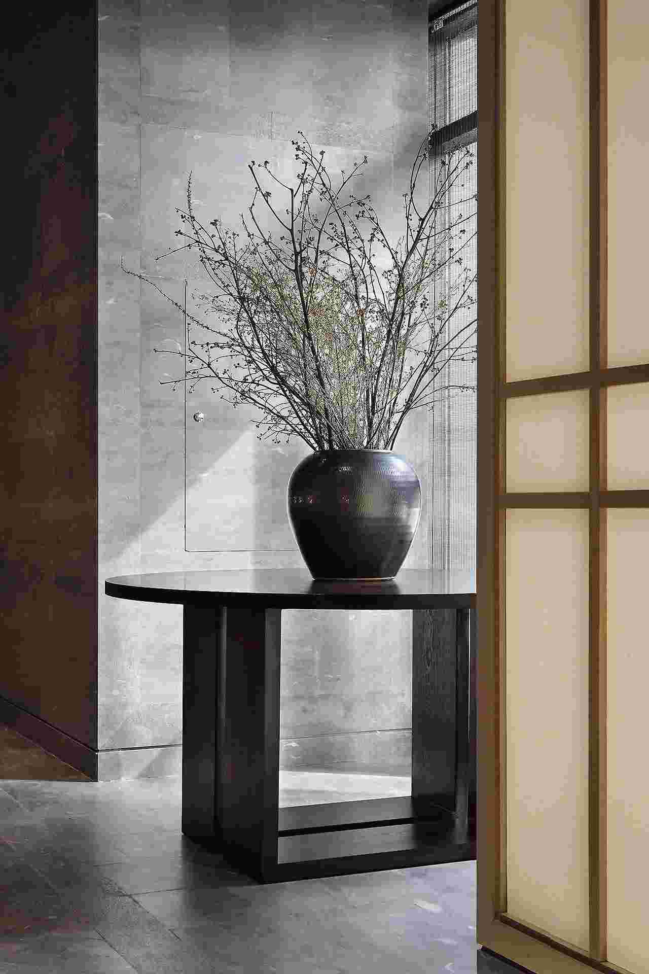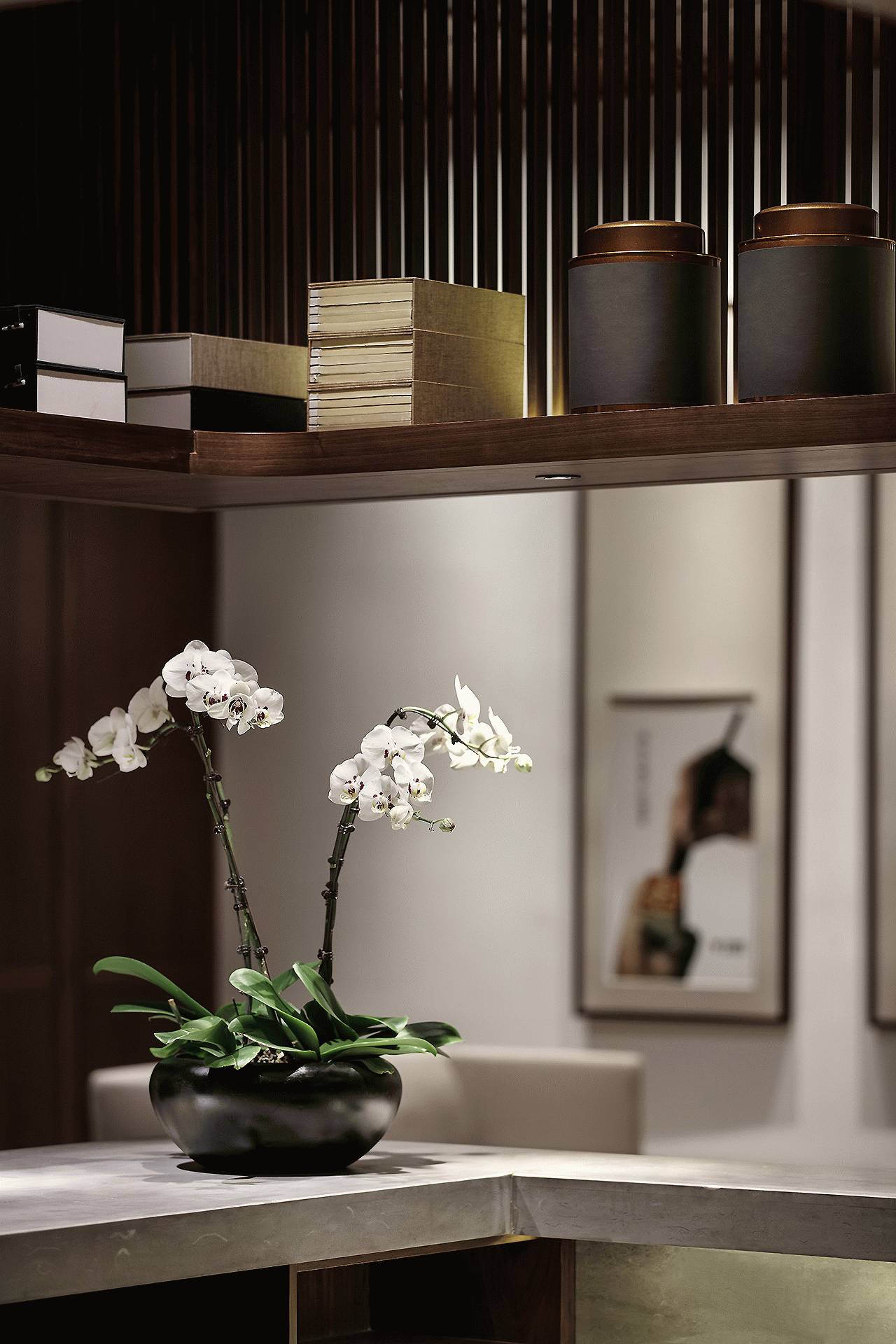 迎賓臺(tái)正中端坐,臺(tái)上一蔟婷婷如素白蘭形同翩翩君子一般佇立,襯在一副同樣素面朝天,拔地而起的中式淡彩畫(huà)墻前,誰(shuí)能說(shuō)得清熟是畫(huà)中物,熟又是畫(huà)外音?此端景恰似中式建筑空間傳統(tǒng)意義上“照壁”的韻味,室內(nèi)景象在它的遮擋下則若隱若現(xiàn)。