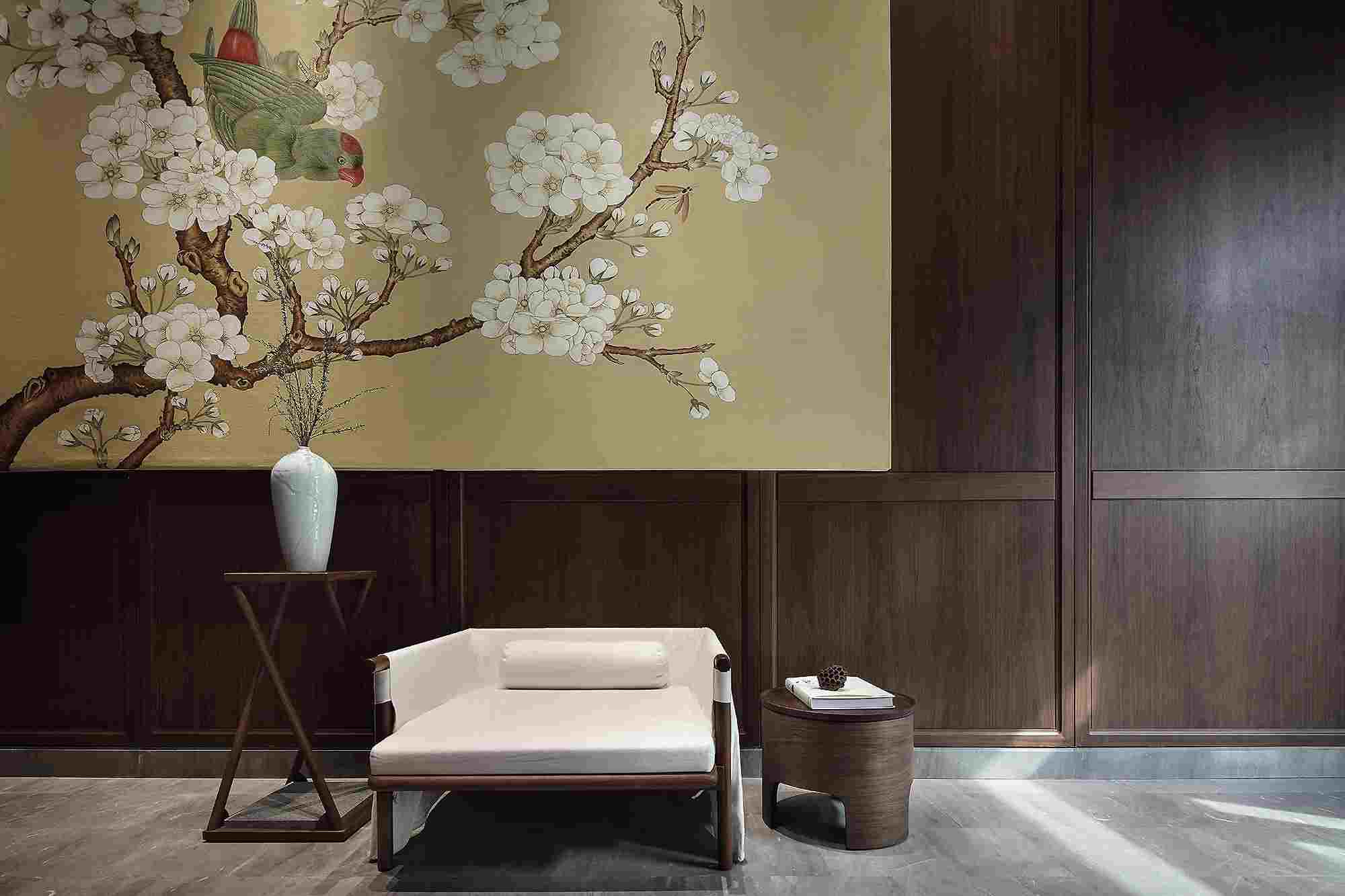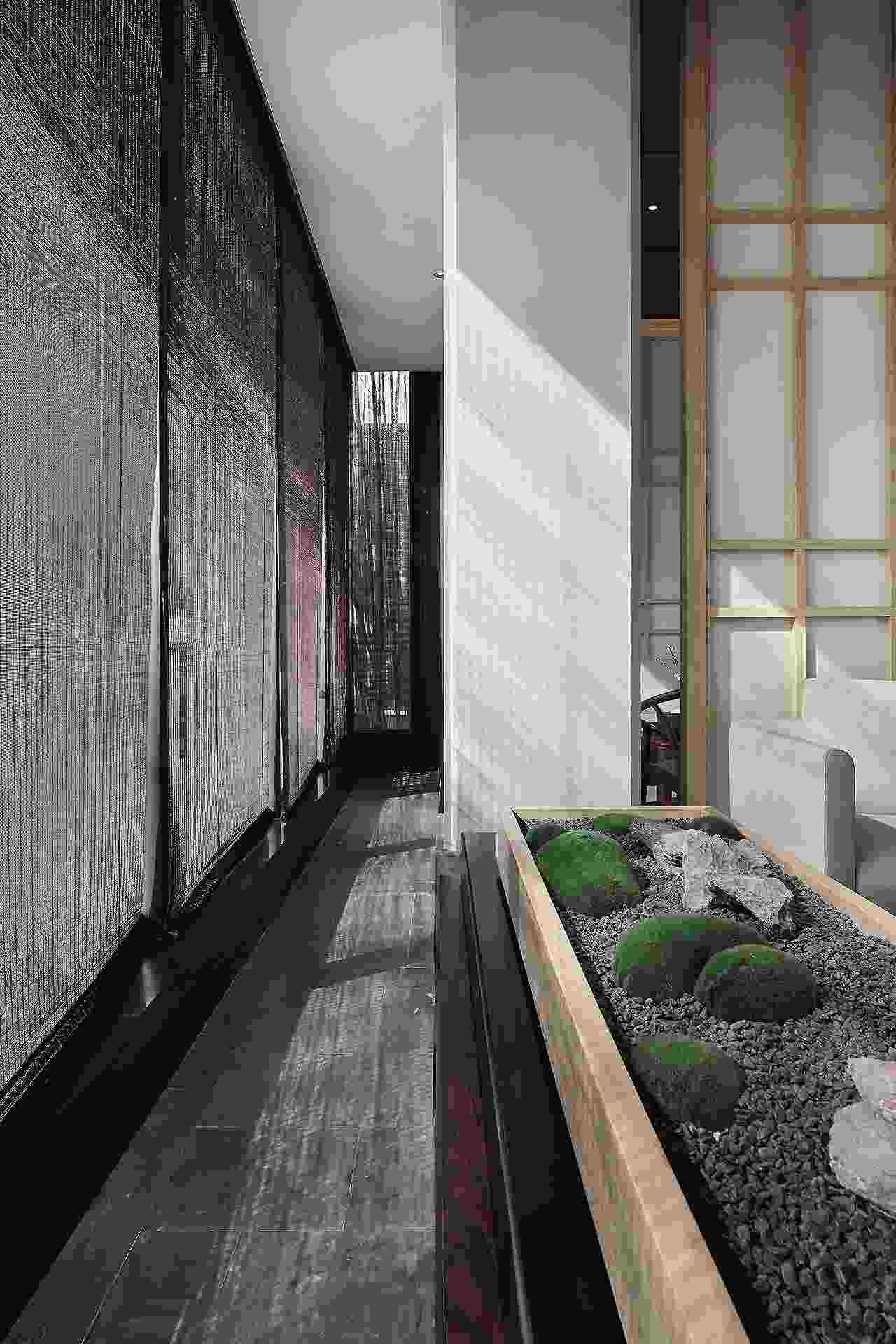 空間主體青灰色系打底,一重一輕兩種木色經(jīng)緯分明的鋪陳于其中,因重復(fù)而形成的序列感讓空間肅然而理性;過(guò)道墻面,水池上方,一行金羽鶴正翱翔于海天之間,自得其樂(lè);而過(guò)道盡頭,一把椅,一張臺(tái),墻上杏花枝頭鸚鵡獨(dú)自嘻戲,空間主旨的待客之道信手拈來(lái)。
