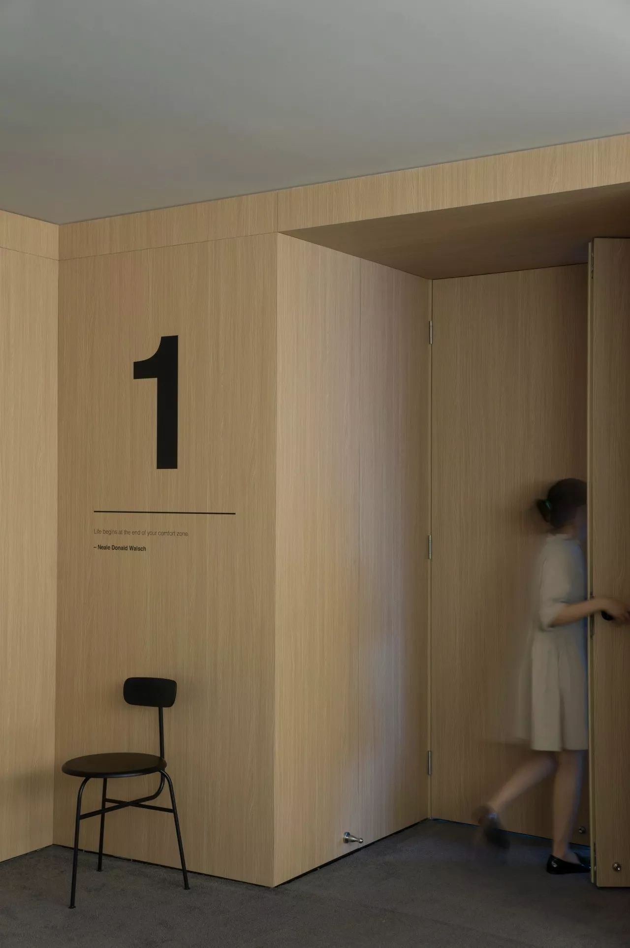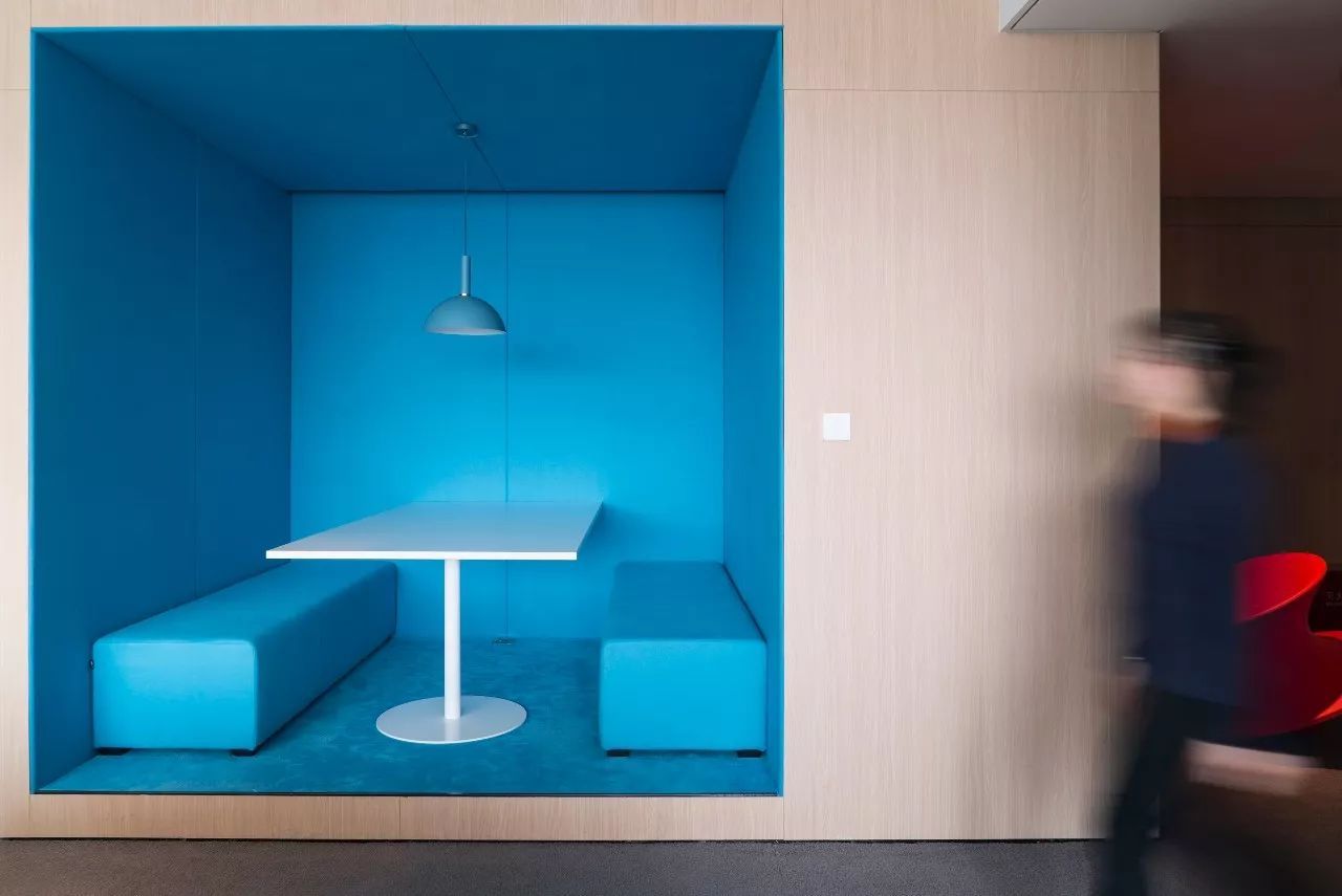 每個單獨的盒子,被賦予簡單純粹的色彩和材質(zhì),比如包裹墻面和天花的彩色吸音毛氈,有效降低與其他區(qū)域的相互干擾,實現(xiàn)**的聲學(xué)效果。人在里面活動時,空間和人的關(guān)系,以及人與人的關(guān)系變得更緊密而有趣,同時獲得一種沉浸式的空間體驗,使討論或工作變的更放松和專注。
