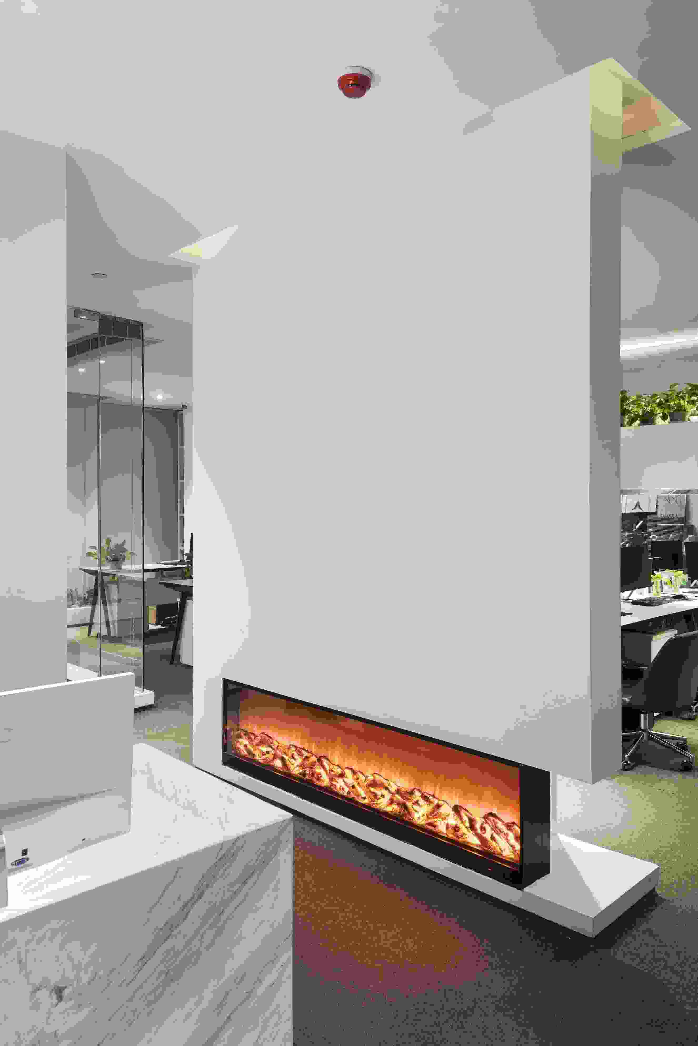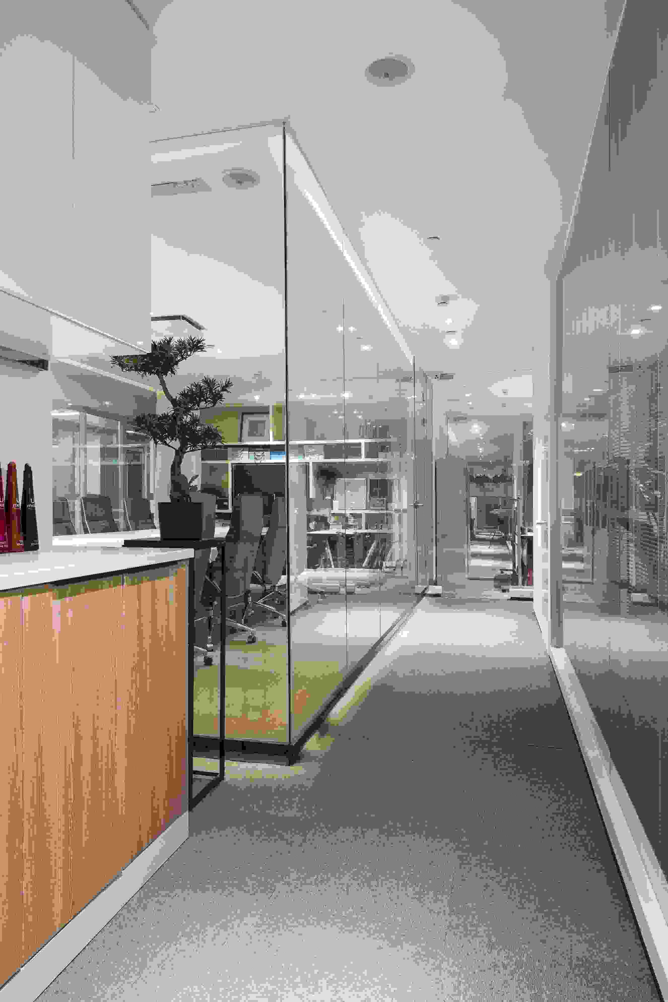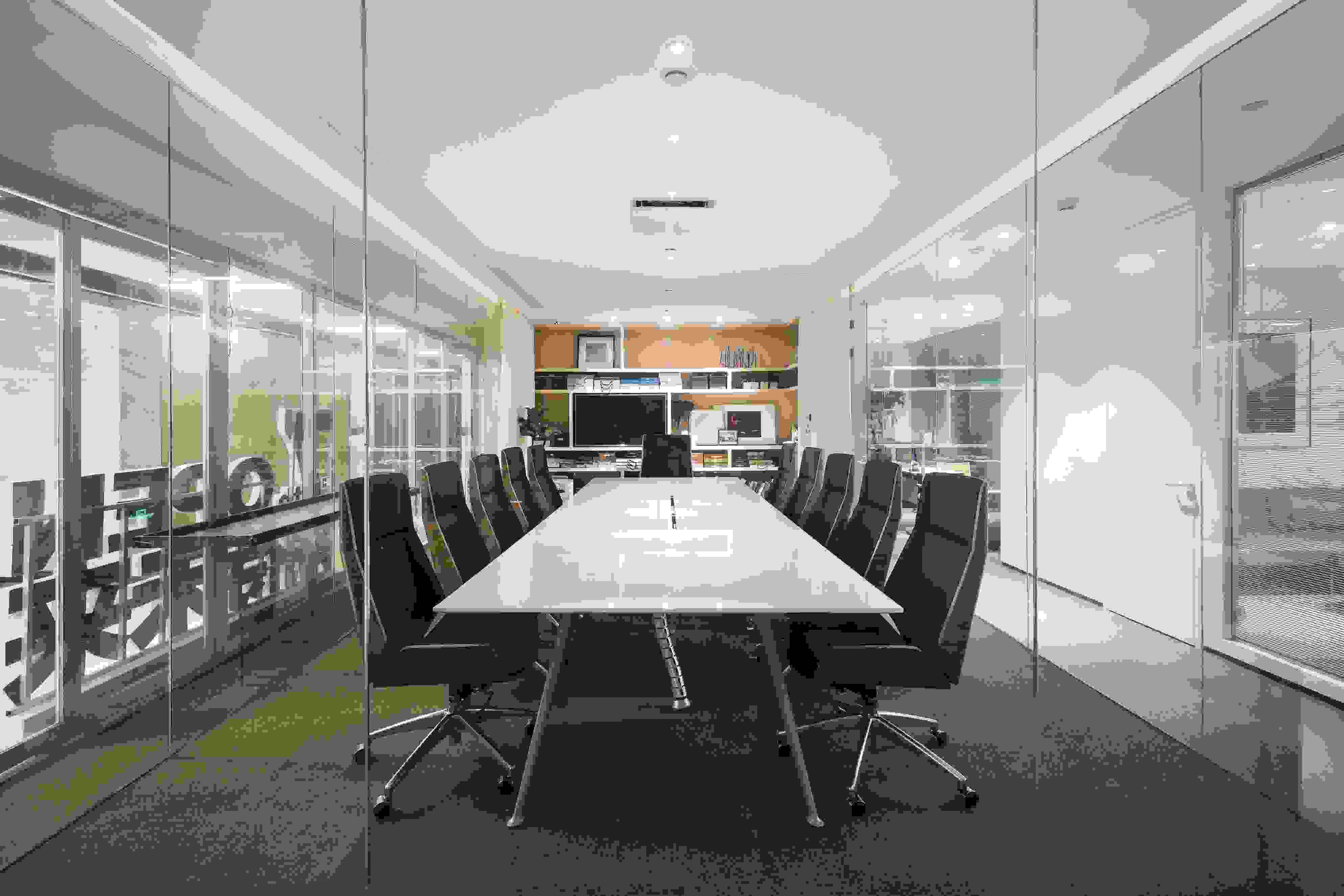會議室以玻璃盒子為設(shè)計(jì)想法,運(yùn)用二次空間的形式,清楚地展示了空間里人與人之間的互動。