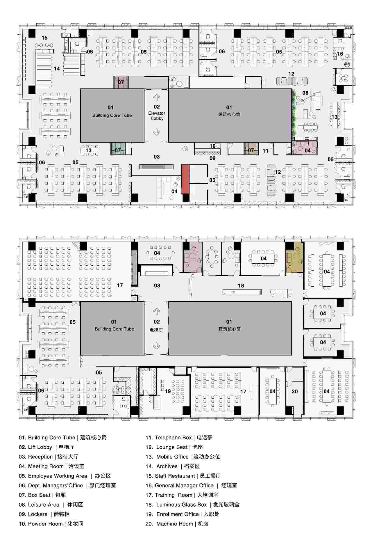 ![]() 中原地產(chǎn)在深圳經(jīng)過二十年的深耕,目前區(qū)域員工達到11000多人,是深圳規(guī)模**的專業(yè)地產(chǎn)代理公司。Peng & Partners (P&P)為其位于深圳后海的新總部辦公空間進行了大刀闊斧、革命性的設計。 ?作為一家港資企業(yè),其過去20年的發(fā)展中,一直秉承著拼搏進取、專業(yè)嚴謹?shù)南愀劬瘢@也反映在老的辦公空間的形象上。在當下的重要時間節(jié)點,企業(yè)希望融合深圳大膽創(chuàng)新的精神,活力、開放與協(xié)作。 ![]() 整個項目包含建筑的四層樓,三層為辦公樓層,另一層為會務中心層。 大廳天花頂部的開孔與立面的開孔相呼應,呈現(xiàn)豐富而有趣的空間構(gòu)成和層次的延伸感。 ![]() ![]() “盒子”的概念貫穿整個設計,通過相減、擠壓、鑲嵌、堆疊等, 對基礎的方塊進行加工變形,產(chǎn)生不同的正相和負相空間,以不同組合方式,串聯(lián)起來。盒子的不同開口方向和尺度,呈現(xiàn)出有趣的對比關系和節(jié)奏:私密與開放、狹窄與舒張、幽暗與明亮… ![]() ![]() ![]() ![]() 每個單獨的盒子,被賦予簡單純粹的色彩和材質(zhì),比如包裹墻面和天花的彩色吸音毛氈,有效降低與其他區(qū)域的相互干擾,實現(xiàn)**的聲學效果。人在里面活動時,空間和人的關系,以及人與人的關系變得更緊密而有趣,同時獲得一種沉浸式的空間體驗,使討論或工作變的更放松和專注。 ![]() ![]() ![]() 為了弱化傳統(tǒng)辦公室的緊張氛圍,公共休閑區(qū)配置了特別大的面積,包括大面積的垂直綠化墻、廚房及水吧。成為員工聚會、休息,或工作交流、頭腦風暴的聚集地。模塊化的沙發(fā),能實現(xiàn)多變的組合方式,以及滿足員工360度全方位的無障礙溝通。 ![]() ![]() 9㎡部門經(jīng)理辦公室,在功能布置上做了很大的改變和創(chuàng)新,所有的功能構(gòu)件沿著空間四周墻面布置,儲物、辦公、休閑、閱讀及交流等,非常巧妙的銜接,使得小面積卻擁有寬敞舒適之感。 ![]() ![]() ![]() 會務中心層的發(fā)光玻璃墻,滿足了整個空間的照明,同時又成為空間的視覺核心,營造出純粹、安靜、脫俗的藝術(shù)辦公空間氛圍。 ![]() ![]() ![]() ![]() ![]() ![]() ![]() ![]() 整體空間的人流動線簡潔清晰,工作交流快速**。 ![]() ![]() ![]() ![]() ![]() 空間的平面指示系統(tǒng)設計,結(jié)合簡潔的造型體塊、線條和光線,呈現(xiàn)出耳目一新、時尚優(yōu)雅的氣質(zhì)。 ![]() ![]() 整個設計過程中,都在嘗試對傳統(tǒng)的辦公方式帶來改變,創(chuàng)造一個嶄新愉悅的工作體驗。 ![]() ![]() ![]() ![]() 平面規(guī)劃: 依據(jù)場地的條件,以及體現(xiàn)企業(yè)文化和對員工的關懷,優(yōu)先保證各個部門擁有*有利的采光、通風和*佳的景觀視野,員工辦公區(qū)域設置在靠窗的位置,部門參照柱位劃分。其余的功能區(qū)塊,如儲物、洽談區(qū)、影印室以及電話亭等,沿建筑核心筒集中排列。 ![]() |
