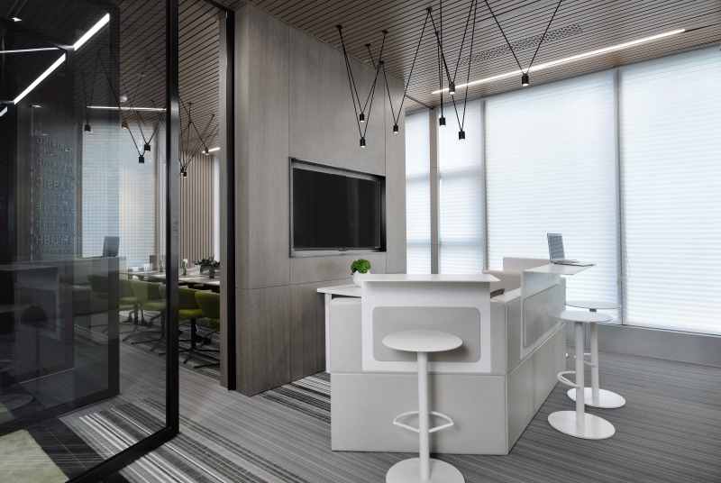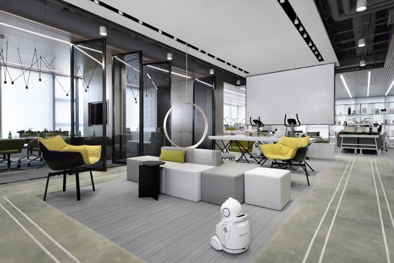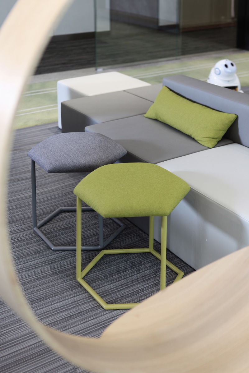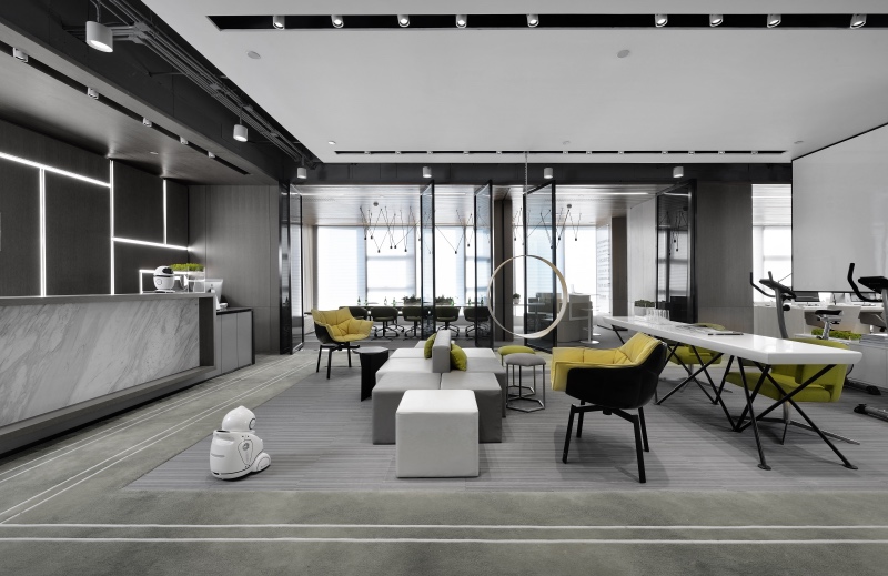 門廳區(qū)域摒棄傳統(tǒng)冷冰冰的接待形式,由超級(jí)吧臺(tái)、茶歇區(qū)、健康辦公區(qū)、討論區(qū)等功能組合而成,把互聯(lián)網(wǎng)開(kāi)放性思維植入到日常辦公生活中。同時(shí)利用健康跑道地毯將整個(gè)空間串聯(lián)起來(lái),讓空間更加具有活力和生氣。