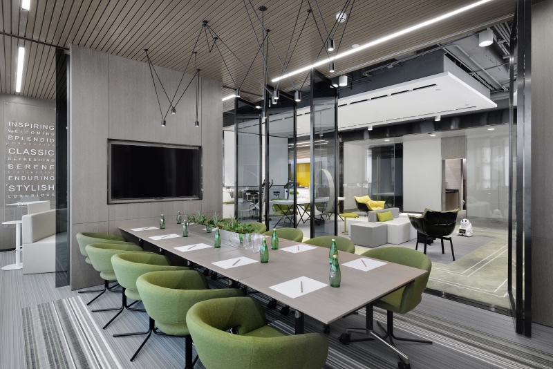 會(huì)議空間分為兩個(gè)空間,一個(gè)是集會(huì)議、培訓(xùn)、活動(dòng)于一體的多功能會(huì)議室,另一個(gè)集洽談、路演、討論于一體的創(chuàng)意互動(dòng)區(qū),僅需開(kāi)關(guān)移門,即可讓空間改變不同的功能屬性,迅速與其他場(chǎng)所互動(dòng)。