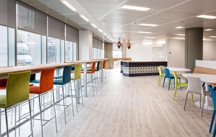 1、設(shè)計師們在整個辦公室設(shè)計方案里,充分的利用周邊落地的大窗戶,較大限制的在室內(nèi)引入了自然光線,把這里打造成了一個活潑明亮的地方。辦公空間里有特色的照明設(shè)計,給這個精簡的設(shè)計理念帶來一種戲劇化的效果。家具的選色,也真實的反映出了輕快亮麗的公司特性。整個空間包括一個圖書室、一個開放的讀書區(qū)、一個鋪著美麗陶瓷地磚的休息區(qū)、會議室、協(xié)同工作區(qū),以及柔軟舒適的非正式會面區(qū)。