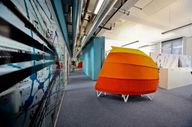 4、國外某報紙出版社辦公室裝修設(shè)計要求現(xiàn)代,新潮。開放式的空間和透明的玻璃使室內(nèi)都變得通透起來,幾何或數(shù)字的涂鴉,充滿個性又兼具激勵員工,藍(lán)色和橙色的漸變十分的搶眼!