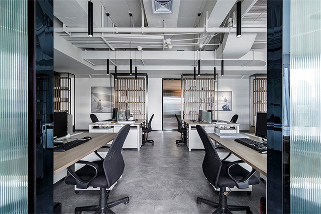 1、極簡風格550平辦公室設計案例:空間的形式做到了極簡,沒有任何多余裝飾,橡木豎向格柵、乳膠漆墻、半透明玻璃移門、平頂天花、開放式天花、橡木飾面的柜子及門扇概括了所有的造型。通過這些簡單的形式,以營造出通透流暢的空間,空間可以通過格柵門及玻璃門開放或密閉,從而滿足不同的使用需求。豎向格柵使得空間具有了多層次的穿透與流動,讓路徑串聯的每一個獨立空間可以借由半透明玻璃門產生視線上的交叉,而視覺的穿透還保證了空間的連續(xù)性。走廊和辦公區(qū)用格柵書架作為隔斷,整齊疊放的書籍與辦公桌上的植物使辦公環(huán)境更加輕松舒適。