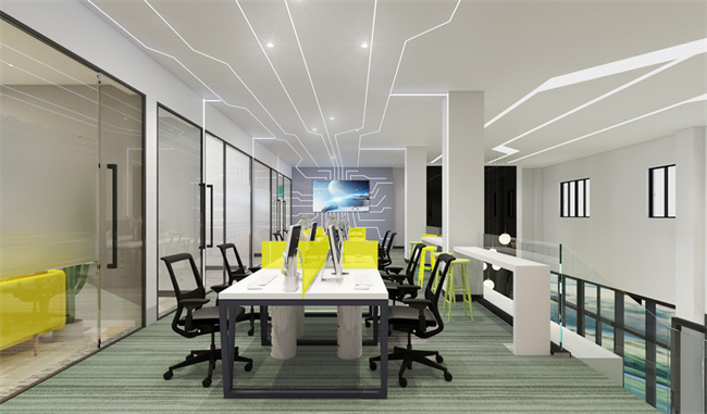 3、550平科技辦公室設計裝修:空間分成兩層,為了更好的滿足甲方的各種需求,設計師利用部分硬裝造成一種空間上穿插的效果,達到視野上的開闊性。色彩上面以客戶要求表現活力(綠色調)為主,再以色彩上的搭配,營造出一種賦予有生命力、活力、五彩斑斕的公司。再配以展示電子產品技術為主題的設計,達到客戶想要的效果及體驗。