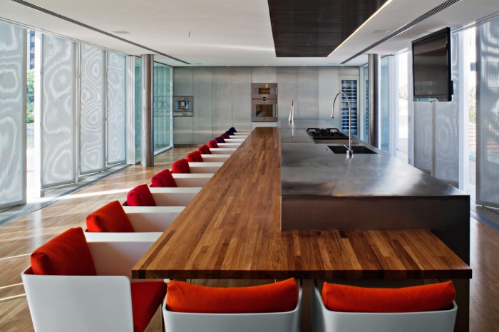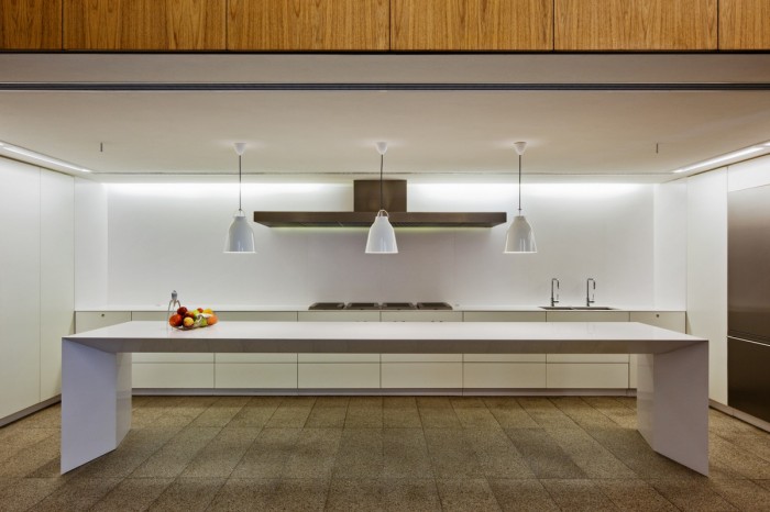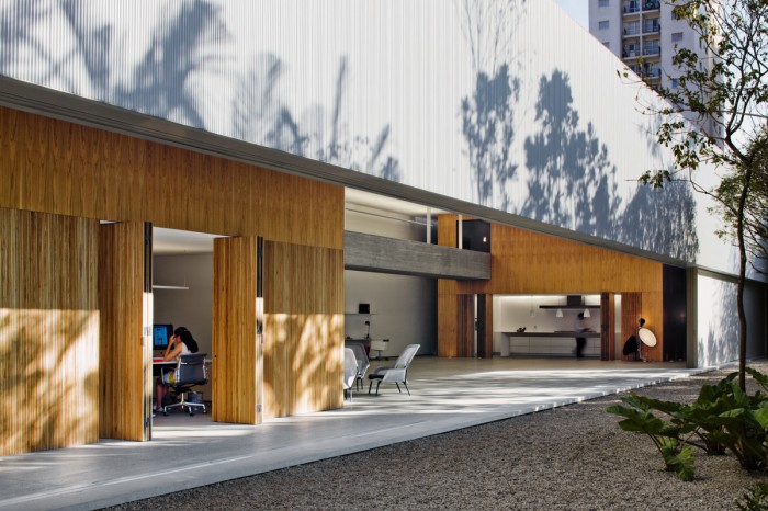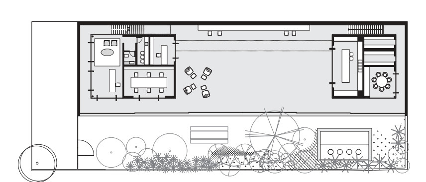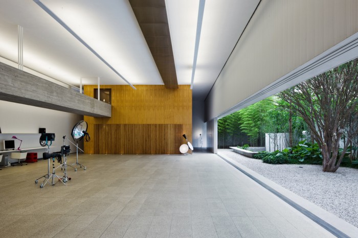千羽工作室的建筑在長(zhǎng)方形的土地上被分為兩部分,北部是43.5米長(zhǎng)7.2寬的花園,南部為43.5米長(zhǎng)12.2米寬的工作室主體結(jié)構(gòu)。工作室的入口在花園一側(cè),通過一排滑動(dòng)的金屬門可以進(jìn)入到工作室內(nèi)?;瑒?dòng)門全部打開可以直接與外部花園共享,進(jìn)入建筑內(nèi)可以看到一個(gè)混凝土人行道在空中將兩個(gè)木制盒型的空間鏈接,而且具有很強(qiáng)的視覺沖擊力。