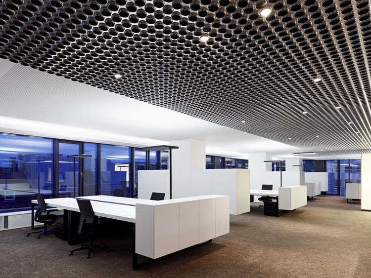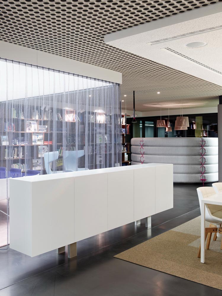 其概念是設(shè)置一個(gè)為所有部門共用的交流空間,以及滿足不同協(xié)作需要的不同分區(qū)。原先單獨(dú)、分散化的辦公室變成大型開(kāi)放式的辦公空間,鼓勵(lì)同事之間的交流。每一個(gè)樓層都有單獨(dú)的辦公室和單獨(dú)的工作組空間,以及大型開(kāi)放式工作間。各個(gè)工作站的工作人員能夠相互交流。玻璃立面的辦公室中,十字形的結(jié)構(gòu)將開(kāi)放式的空間分隔為各個(gè)單元,但又是集中的工作環(huán)境。一系列暖色調(diào)的材料營(yíng)造出不同的氣氛,有時(shí)候讓員工感覺(jué)到像在家里一樣。辦公樓中的地毯有著清晰的路徑指示和功能分區(qū)。就餐區(qū)地板上的綠點(diǎn)如同變魔術(shù)一樣變出草地的效果,構(gòu)筑起通向露臺(tái)的一道概念式的橋梁。向露臺(tái)打開(kāi)的半圓形裝飾空間與其他部分區(qū)分開(kāi)來(lái),透明的蕾絲幕布構(gòu)成了半私密的空間,而清新的色彩、深藍(lán)色的桌子和粉色的地毯,無(wú)不為員工帶來(lái)激發(fā)工作情緒的氛圍。